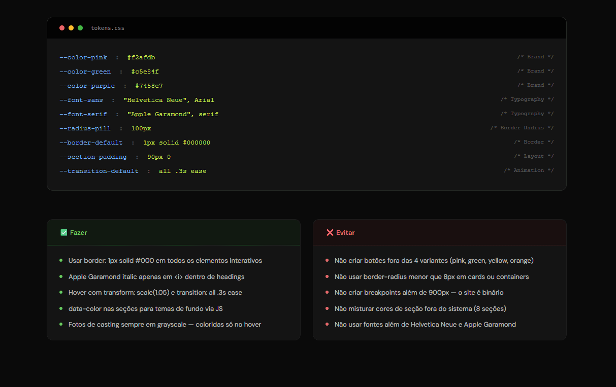 Tokens CSS prontos para código, Do's & Don'ts e acessibilidade documentada.