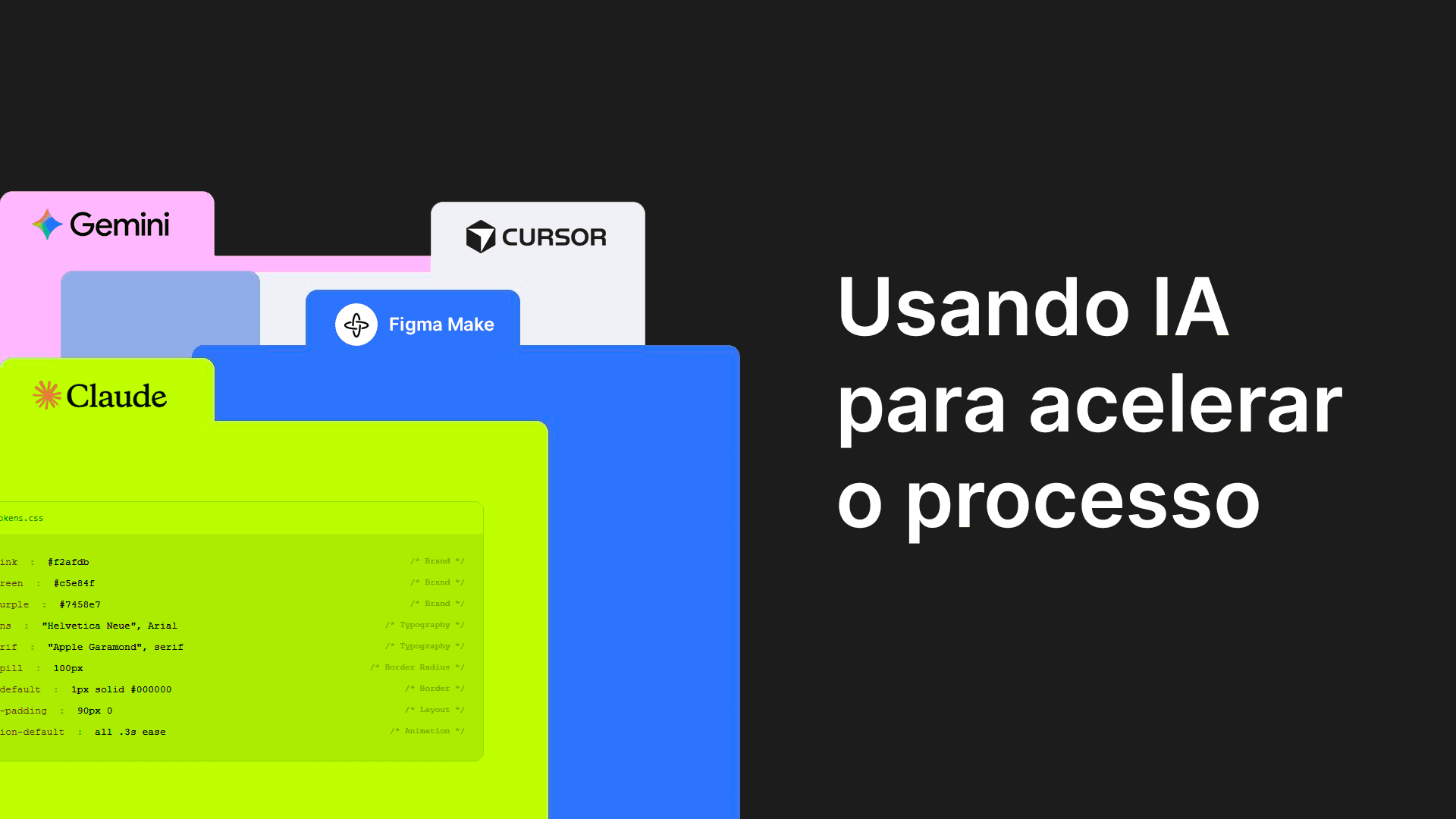 O processo foi iterativo: eu definia a direção, revisava os resultados via screenshots capturados em tempo real, e a execução acontecia na sequência. O Figma Make entrou para acelerar partes da estrutura visual, complementando o fluxo de trabalho. Decisões de estrutura do sistema, revisão visual de cada etapa, refinamentos manuais e toda a curadoria do que entrava ou não no DS. A IA acelerou a execução seguindo meu raciocínio.