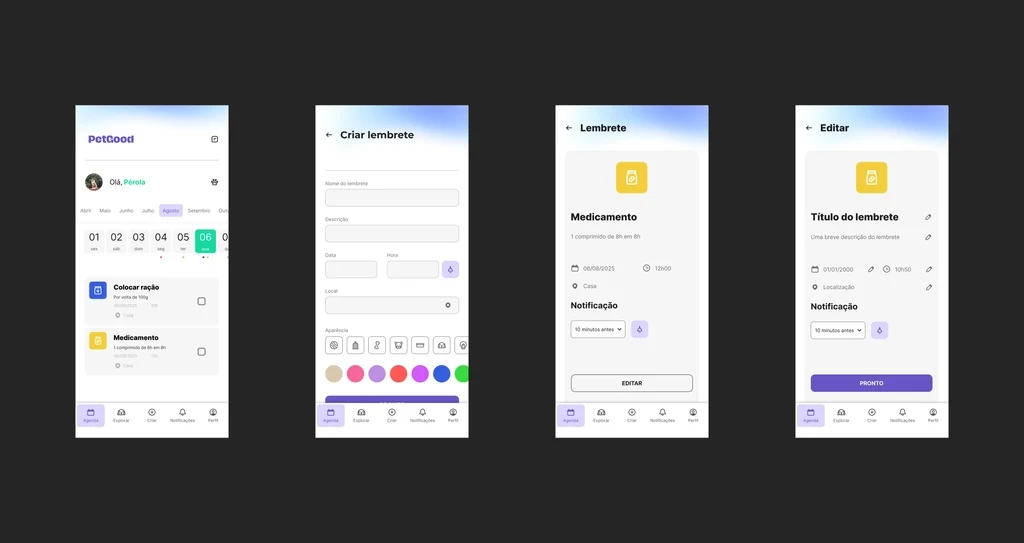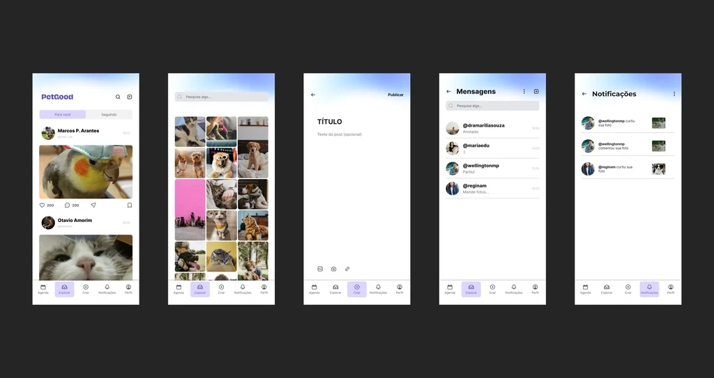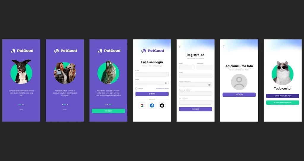 A principal questão levantada pelos usuários foi o motivo da aba social não ser a "página inicial", mas foi mais por questão de familiaridade com outros aplicativos sociais. Outra coisa apontada foi a confusão no momento de gerenciar os perfis pet. Questionamentos levantados após o teste: quais as funcionalidades devem ser priorizadas no MVP? Qual a prioridade do produto? O que poderia ser descomplicado? E pra concluir... Inicialmente criado para organizar as tarefas do dia a dia com pets, o PetGood evoluiu para se tornar uma plataforma completa de bem-estar animal. Integrando gestão de saúde pet com funcionalidades de rede social, o PetGood busca se consolidar como referência digital no cuidado com os animais. Essa evolução é resultado de um processo contínuo de pesquisa e escuta ativa das necessidades do público-alvo. No futuro, a plataforma pretende expandir ainda mais seu ecossistema, conectando-se a clínicas veterinárias, petshops, ONGs e iniciativas de adoção, promovendo uma rede colaborativa em prol dos pets. Fiquei extremamente satisfeito com o resultado deste projeto, que me proporcionou a oportunidade de aprofundar conhecimentos, desenvolver novas técnicas e aprimorar minhas habilidades na área de UX/UI.